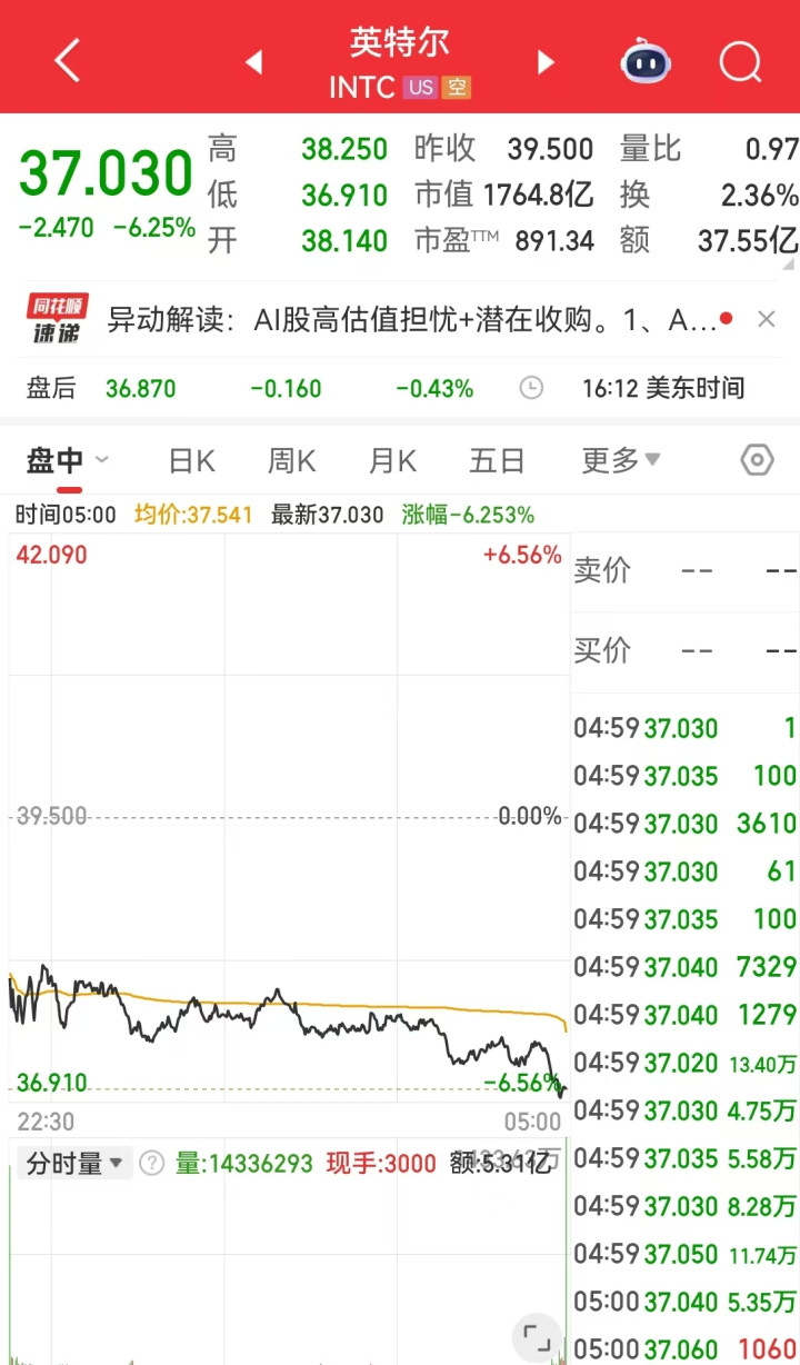 大型科技股普跌,英特尔跌超6%;特斯拉跌超5%,市值一夜蒸发802亿美元(约合人民币5718亿元);英伟达跌超3%,市值一夜蒸发1990亿美元(约合人民币14188亿元);谷歌跌逾2%;亚马逊、Meta跌超1%;苹果小幅上涨。
